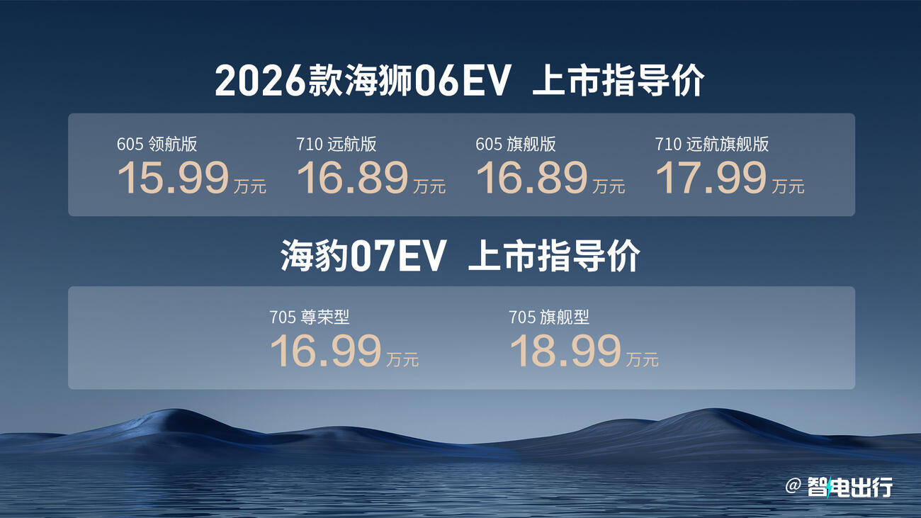 2026款海獅06EV無疑是此次發布會的焦點之一。這款車搭載了二代刀片電池和全新閃充技術,充電效率令人驚嘆。在常溫環境下,車輛電量從10%充至97%僅需9分鐘;即便在零下30度的低溫環境中,20%充至97%也只需不到11分鐘。續航方面,海獅06EV最高可達710公里,充分滿足了日常通勤和長途出行的需求。在智能配置上,它可選裝天神之眼5.0系統,支持城市和高速領航輔助以及全場景泊車功能。舒適性配置也十分豐富,包括座椅記憶、按摩、副駕腿托和香氛系統等。云輦 - C系統增加了路面預瞄功能,還搭載了高速爆胎穩行系統,進一步提升了行車安全性和舒適性。價格方面,2026款海獅06EV的售價區間為15.99萬 - 17.99萬。