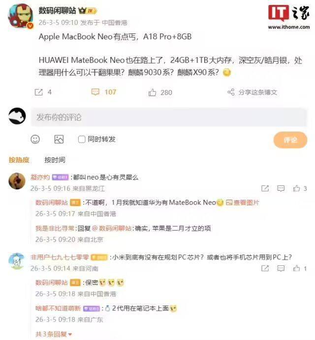 關于核心處理器信息,爆料者并未直接公布具體型號,而是拋出兩個可能性選項引發(fā)網(wǎng)友討論——麒麟9030系或麒麟X90系。這種懸念式爆料方式迅速點燃了科技愛好者的討論熱情,相關話題在社交平臺持續(xù)發(fā)酵。值得注意的是,該博主此前曾于1月就提及過華為存在MateBook Neo的研發(fā)計劃,此次爆料可視為對前期信息的補充確認。