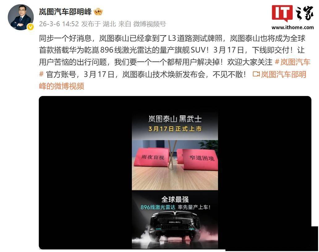 嵐圖汽車CBO、銷售公司總經理邵明峰近日透露,嵐圖泰山已成功獲得L3道路測試牌照,并將成為全球首款搭載華為乾崑896線激光雷達的量產旗艦SUV。這一消息無疑為即將到來的發布會增添了更多期待。邵明峰還表示,3月17日,這款新車將實現下線即交付,為消費者帶來前所未有的智能駕駛體驗。