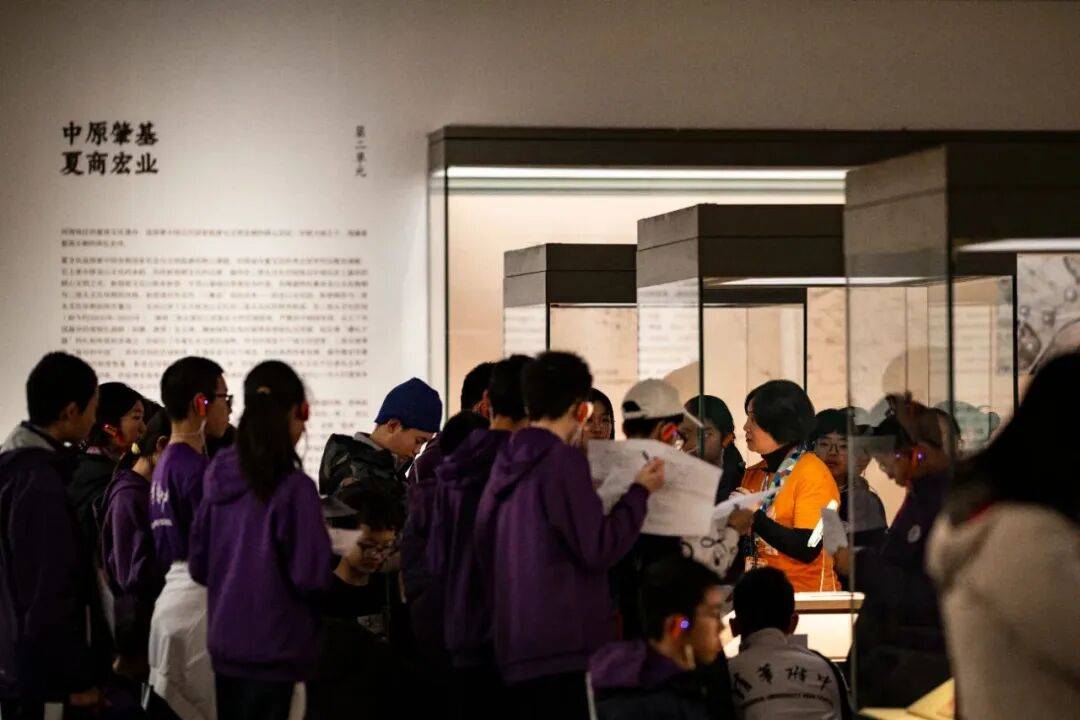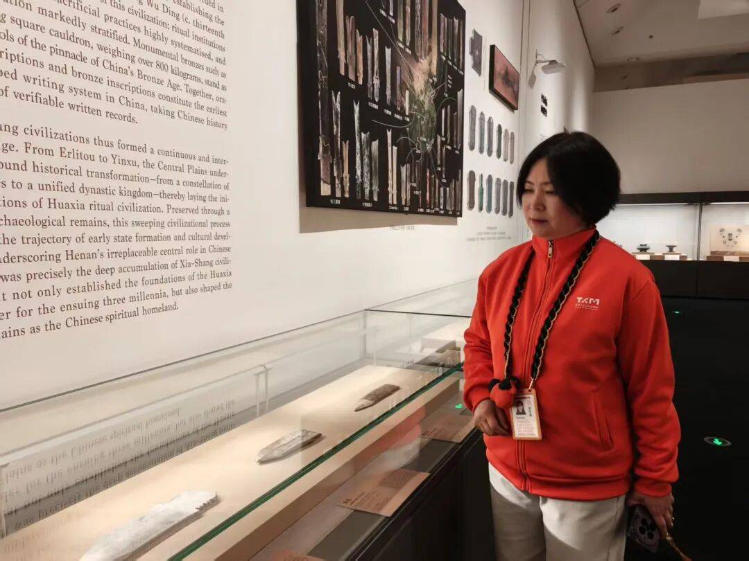 面對研學團隊與散客疊加的情況,郭冬梅需要靈活應對。展廳入口處的賈湖遺址骨笛和龜甲展品前常出現多個團隊同時講解的現象,她會及時介入疏導,引導觀眾分批次參觀。“有時需要協調講解順序,有時要建議觀眾先瀏覽其他展品,避免人員聚集影響體驗。”她的細致工作確保了展廳秩序井然。