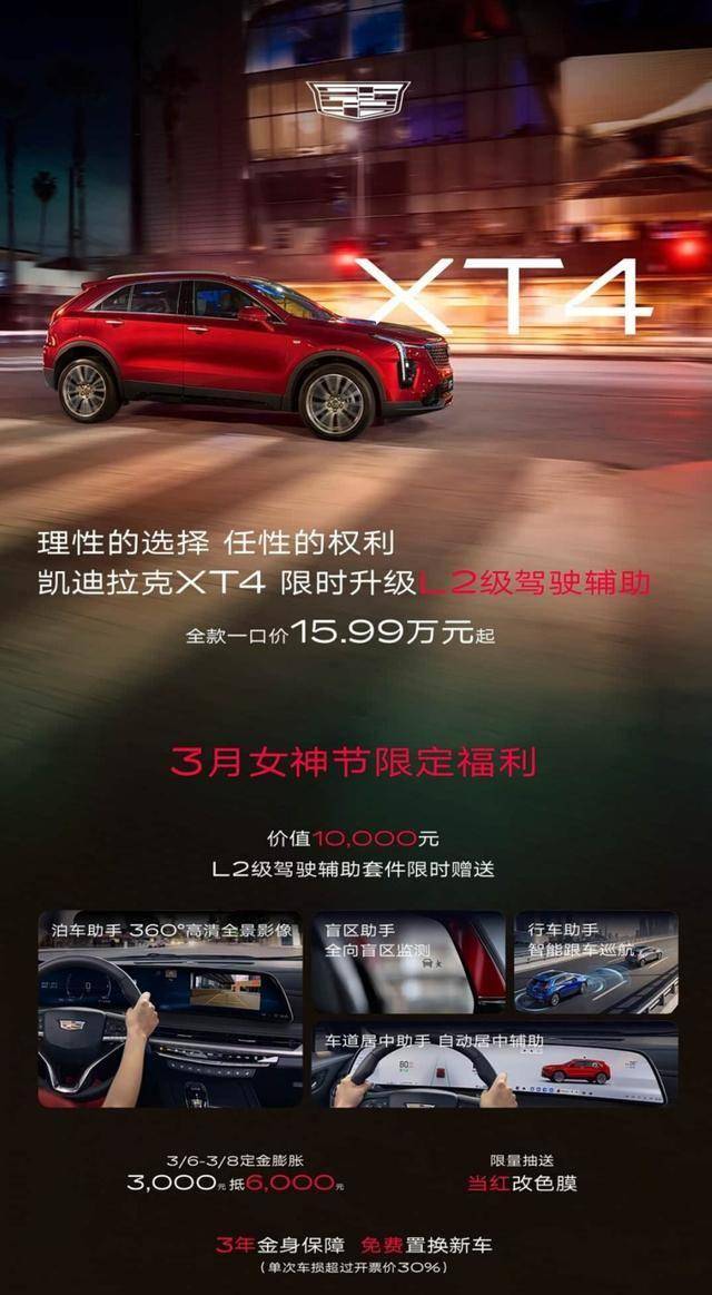 豪華緊湊型SUV市場迎來新一輪價格風暴!凱迪拉克新款XT4以15.99萬元起售的"一口價"策略強勢入局,不僅將官方指導價下探至22.97-27.57萬元區間,更推出限時贈送價值萬元的L2級智能駕駛輔助包、定金膨脹等組合優惠,直接向寶馬X1、奧迪Q3等傳統豪強發起挑戰。這款美系豪華SUV憑借越級配置與極致性價比,正在重塑15-20萬元級市場的競爭格局。