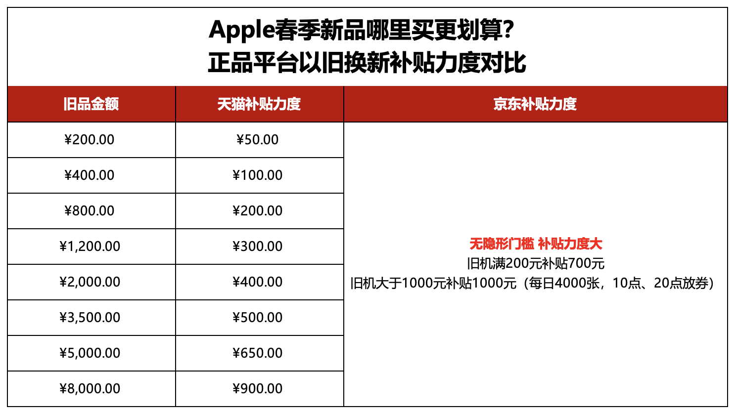 大家選擇以舊換新主要是為了省錢,而在補貼力度方面,天貓的力度遠小于京東。舊機金額滿200元,天貓補貼50元,而京東補貼700元;舊機金額滿1000元,天貓的補貼在300-900之間,而京東卻補貼1000元,跟天貓的差距就顯而易見了。不過需要注意的是,想要得到1000元的以舊換新大額券,需要每天10點、20點搶券哦,搶到就是賺到。
