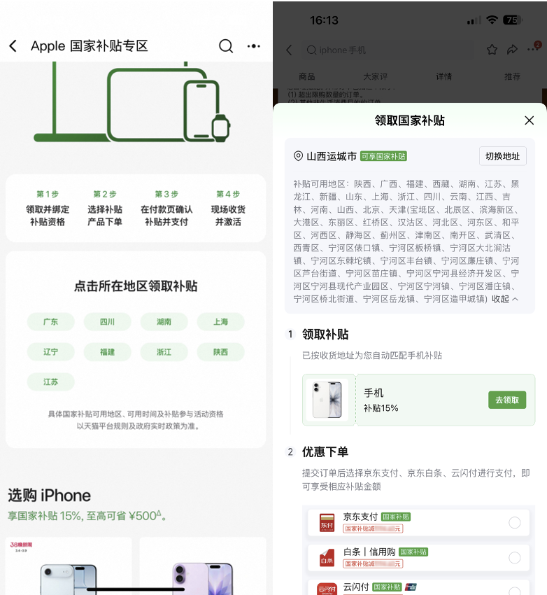 首先是國補、教育優惠方面,各大平臺優惠的力度都是一樣的,稍有區別的僅有上線城市了。目前天貓國補上線的城市只有廣東、四川、湖南、上海、遼寧、福建、浙江、陜西、江蘇9個省市,而京東上線了陜西、廣西、福建、西藏、湖南、江蘇、黑龍江、新疆、山東、上海、浙江、四川、云南、江西、吉林、河南、山西、北京、天津、安徽等20個省市,比天貓多11個地區。