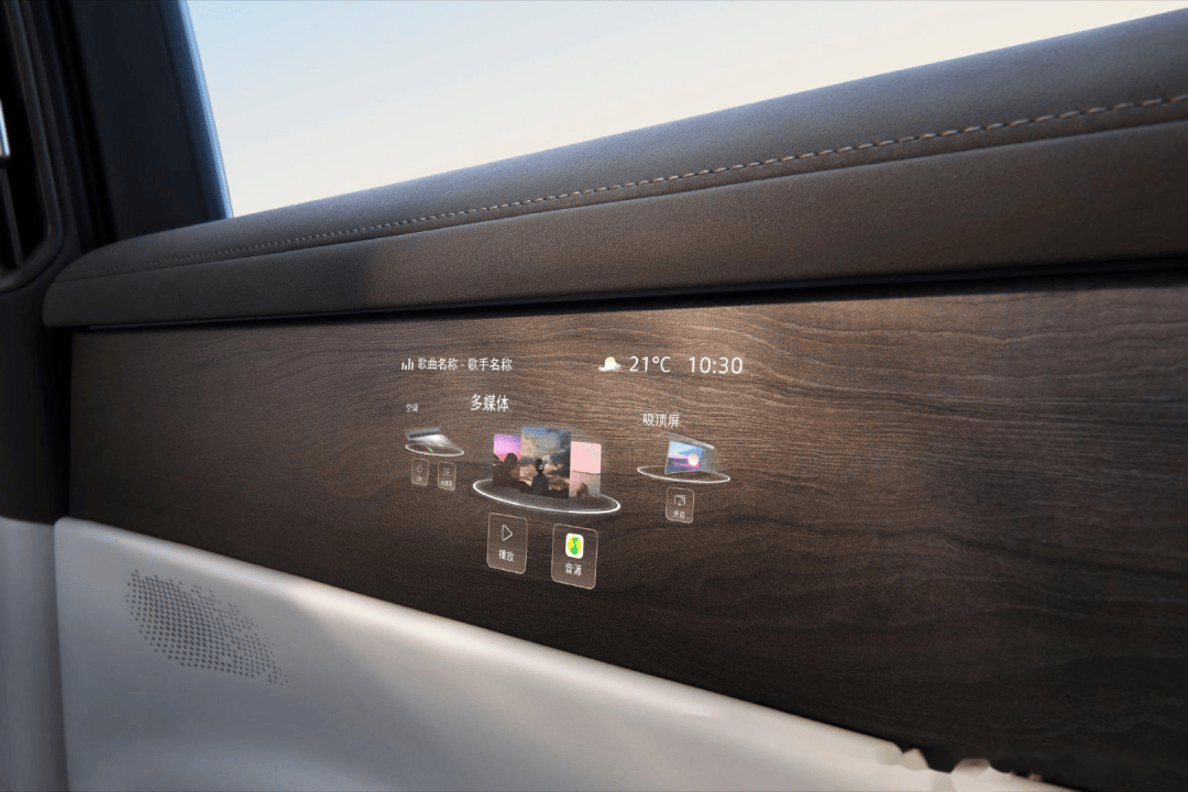 傳統儀表盤在這款車上徹底消失,取而代之的是嵌入木紋飾板的超薄屏幕。當車輛啟動時,車速、導航等關鍵信息通過微孔膜片技術精準投射;熄火后,屏幕與飾板渾然一體,僅留下天然木紋的溫潤質感。這種設計巧妙解決了科技感與豪華感的矛盾——既保留了實體材質的觸覺體驗,又實現了數字化信息的無縫集成。