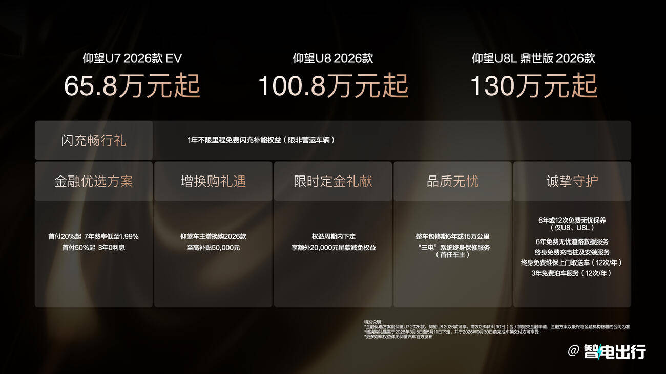 值得注意的是,26款仰望U8成為唯一價格下調的車型,較23款直降9萬元至100.8萬元。該車型搭載574kW峰值充電功率與9C電池倍率技術,滿油滿電綜合續(xù)航達1205公里,同時新增昆侖棕、煙嵐紫兩款內飾配色。價格下探與性能升級的組合,使其在百萬級新能源SUV市場中競爭力進一步增強。