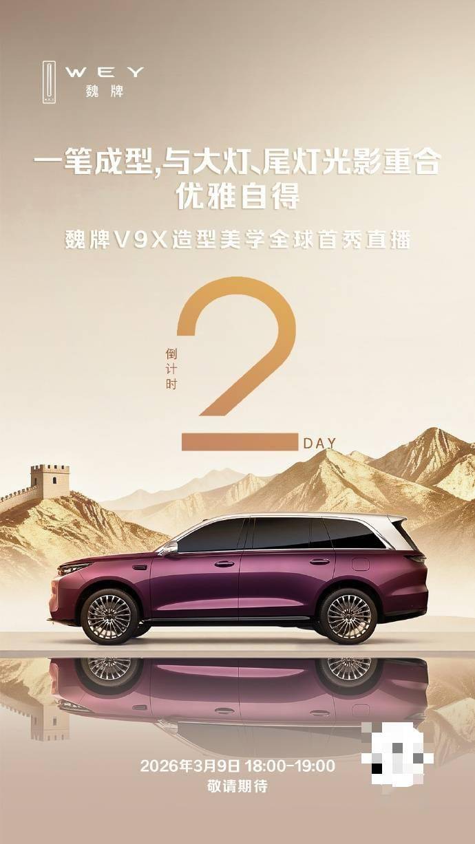 長城汽車近日宣布,旗下魏牌全新車型V9X的造型美學全球首秀直播活動,將于3月9日18:00至19:00正式開啟。這款由長城汽車董事長魏建軍親自代言的SUV,不僅是長城“歸元”平臺的首款作品,更以東方經典建筑美學為設計靈感,推出紫金雙拼色車身選項,引發市場廣泛關注。