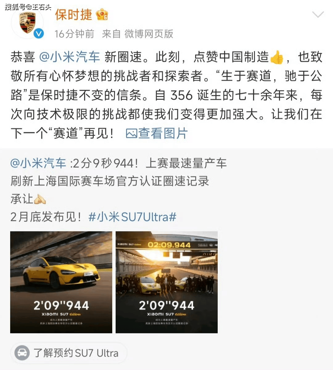 事實上,近年來頂級海外汽車品牌在面對中國制造崛起和新興競爭對手時,都展現出了類似的格局。去年小米汽車SU7 Ultra刷新上賽場圈速紀錄,超越保時捷Taycan Turbo GT,保時捷官方轉發喜訊并點贊:“恭喜小米汽車新圈速。此刻,點贊中國制造,也致敬所有心懷夢想的挑戰者和探索者?!边@種君子之風,體現了對競爭對手的尊重和對行業發展的積極態度。