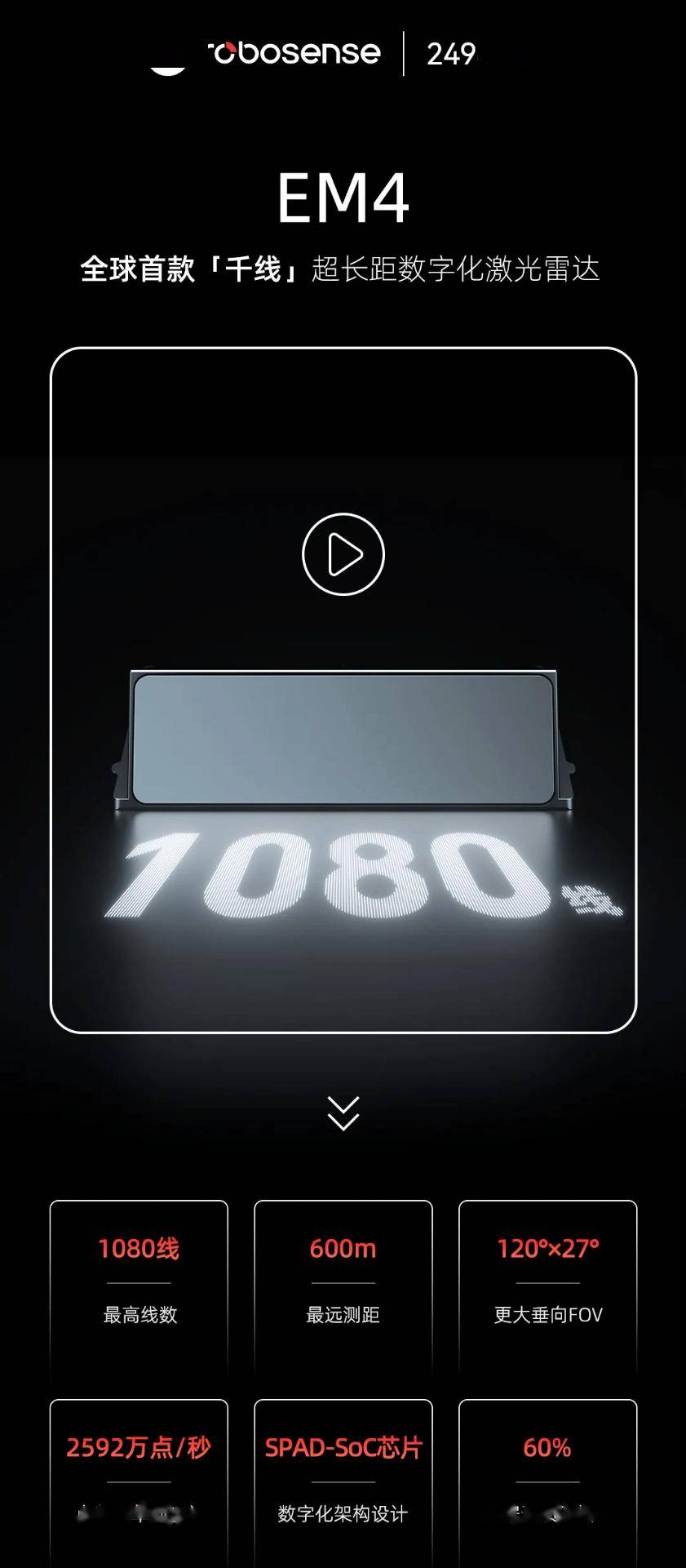 回顧2025年初,速騰聚創推出的EM4激光雷達曾引發廣泛關注。作為全球首款1080線激光雷達,EM4具備最遠600米的測距能力,垂向視場角達到120°×27°,點頻高達2592萬點/秒。這些參數使得EM4能夠清晰探測到600米內的白色車輛、300米內的交通錐桶以及180米內的輪胎,從而顯著提升車輛在緊急情況下的避讓或剎停能力。