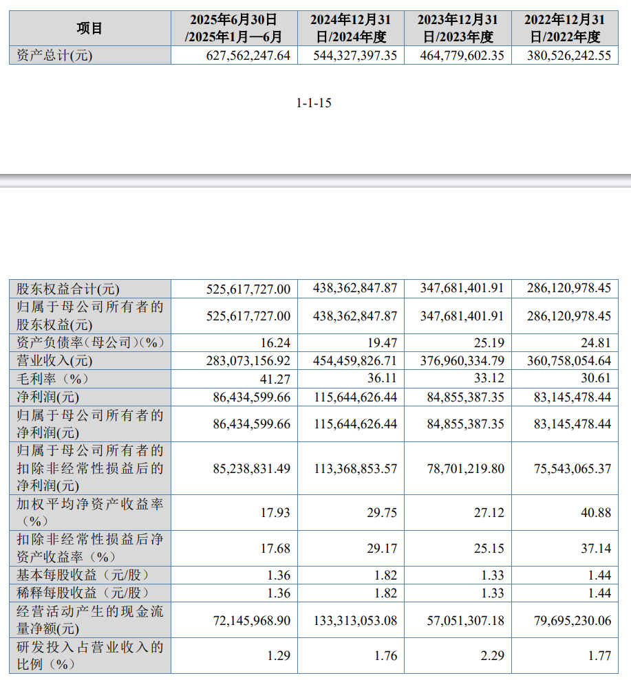 財務數據顯示,2022年至2025年上半年,彩客科技營業收入從3.61億元穩步增長至4.54億元,2025年上半年實現2.83億元;凈利潤同步提升,從8314.55萬元增至1.16億元,2025年上半年達8643.46萬元。主營業務毛利率呈現顯著上升趨勢,同期分別為30.63%、33.12%、36.12%和41.29%,主要受產品銷售價格調整及成本控制能力增強的雙重驅動。與行業平均水平相比,公司毛利率持續保持領先,與秦燕科技等可比企業處于相近區間。