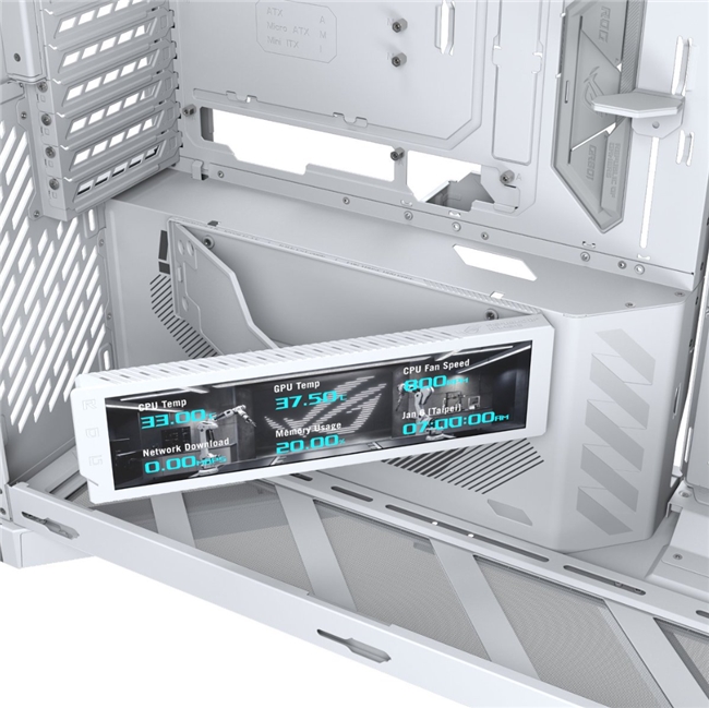 ROG幻世神機箱還配備了9.2英寸LCD屏幕模組,為玩家?guī)砹饲八从械慕换ンw驗。通過這塊屏幕,玩家可以實時掌握硬件狀態(tài)信息,如CPU溫度、風扇轉速等,一目了然,方便快捷。更為重要的是,屏幕支持自定義內容展示,玩家可以根據(jù)個人喜好自由設置圖片、視頻或動態(tài)效果,充分展現(xiàn)自己的個性與創(chuàng)意。無論是展示自己喜愛的游戲角色、動漫形象,還是獨特的藝術作品,都能讓機箱成為獨一無二的存在。