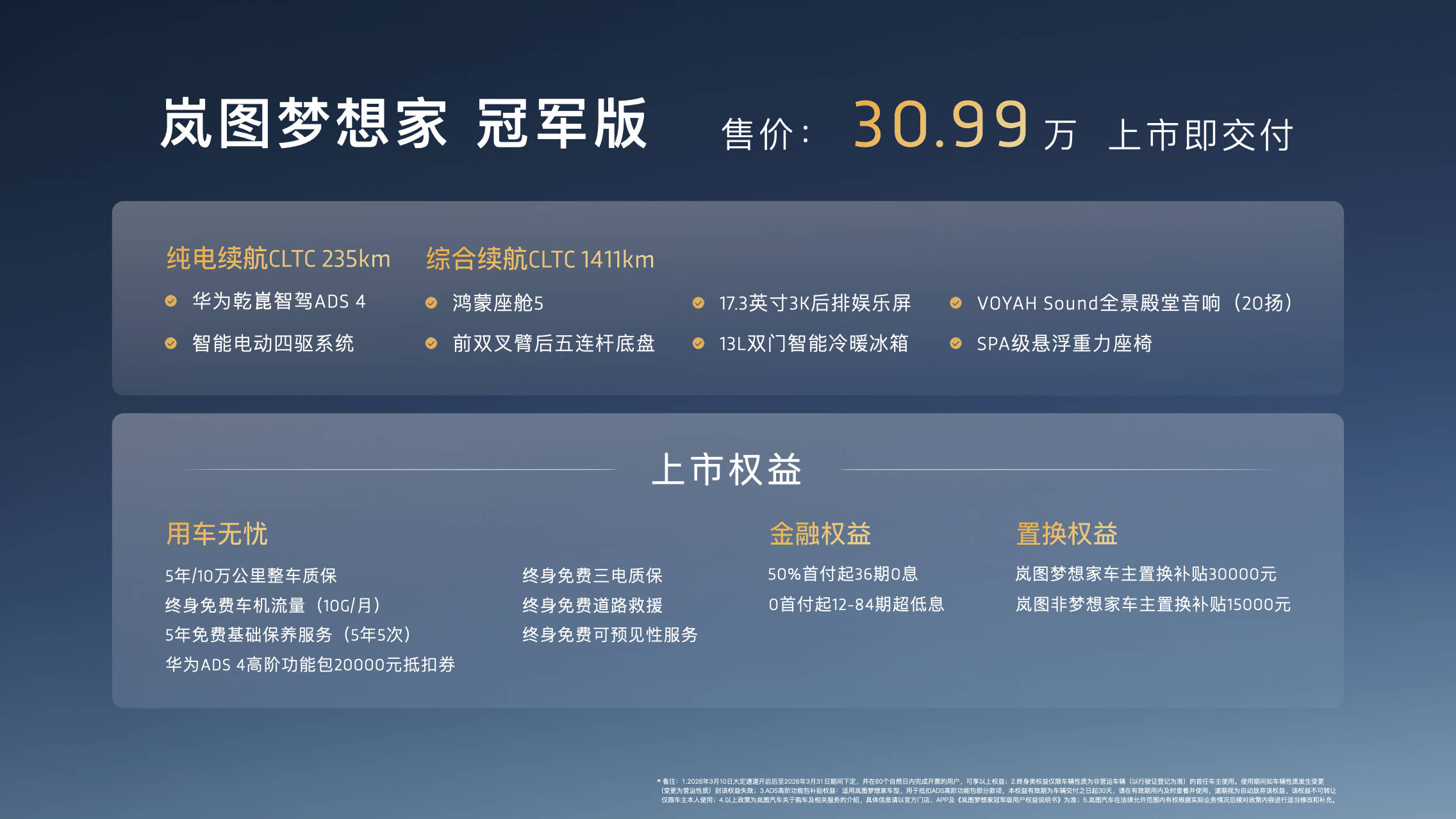 動(dòng)力方面,夢(mèng)想家冠軍版采用1.5T發(fā)動(dòng)機(jī)與雙電機(jī)組成的插電混動(dòng)系統(tǒng),發(fā)動(dòng)機(jī)最大功率150馬力,最大扭矩220N·m,電機(jī)最大功率則分別為前150kW、后160kW。車(chē)輛配備41.7kWh三元鋰電池組,CLTC純電續(xù)航里程可達(dá)235km,綜合續(xù)航里程更是高達(dá)1411km,滿足用戶長(zhǎng)途出行需求。