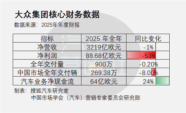 2025年,大眾集團交出了一份喜憂參半的財務答卷。全年收入達3219億歐元,較上年微降0.8%;交付量898.39萬輛,同比減少0.5%;汽車業務凈現金流卻逆勢增長24%,達到64億歐元。然而,營業利潤同比腰斬至88.68億歐元,營業利潤率僅2.8%,這一數據暴露出集團盈利能力的深層危機。
