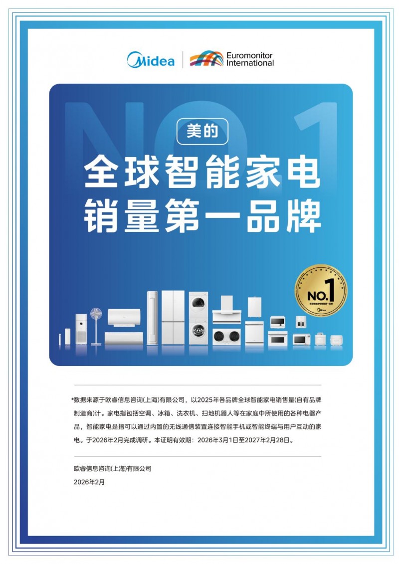 據歐睿信息咨詢(上海)有限公司數據顯示,2025年美的全球智能家電銷量位居行業第一,以絕對優勢領跑全球智能家電市場。