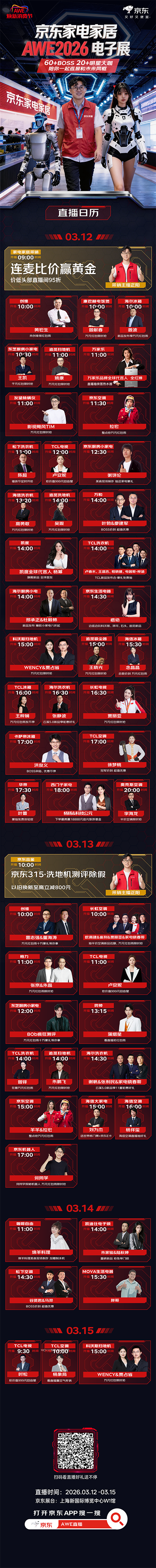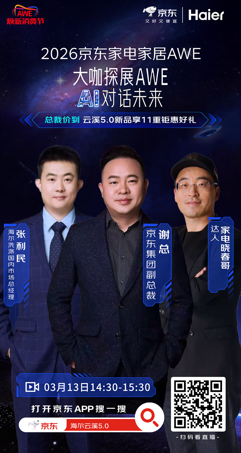作為家電及消費電子領域的重要年度盛會,AWE一直是品牌展示前沿技術、發布重磅新品、連接消費者的重要窗口。今年是AWE的35周年,也是京東與AWE攜手同行的第15年,圍繞本屆展會,京東將整合平臺、品牌與內容資源,推出1000余場直播,把展會熱度與消費場景更緊密地連接起來。消費者在關注行業趨勢和產品創新的過程中,也能更直觀地了解產品亮點、選購重點和優惠信息。
