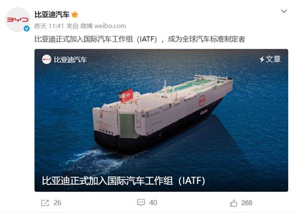 近日,比亞迪正式宣布加入國際汽車工作組(IATF AISBL),成為這一全球汽車質(zhì)量管理體系權(quán)威組織的新成員。此次入會標(biāo)志著中國新能源汽車企業(yè)首次進(jìn)入IATF核心決策層,為國際汽車標(biāo)準(zhǔn)制定貢獻(xiàn)中國智慧。