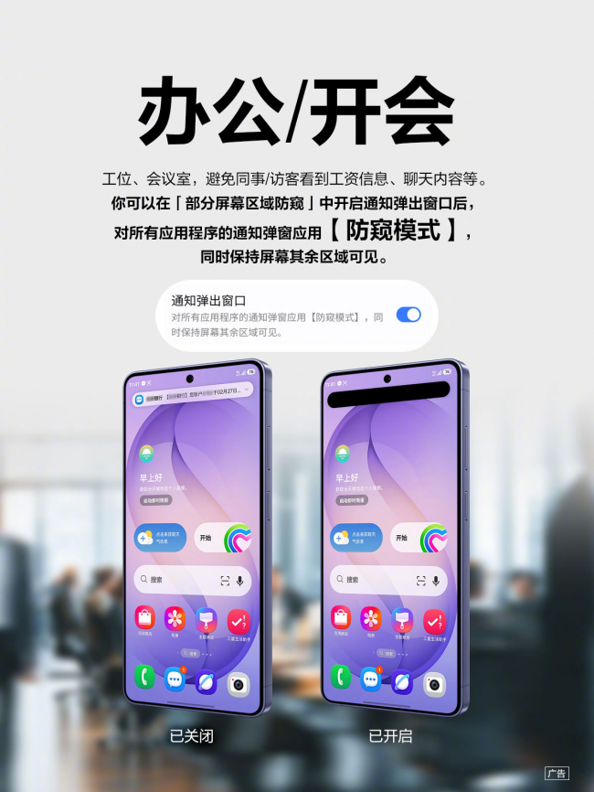 它不是你想象中那種“一鍵開啟”的簡單功能,支持四種個性化防窺模式:全屏防窺、自定義APP防窺、通知彈出窗口與智能識別密碼場景防窺。通勤路上,地鐵/公交/高鐵,防止旁邊人偷看你聊天/照片/支付頁面,可以針對指定應用程序,開啟防窺模式。辦公/開會時,避免同事看到工資信息/聊天內容等,可以在部分屏幕區域防窺中開啟通知彈出窗口后,對所有應用程序的通知彈窗應用防窺模式。