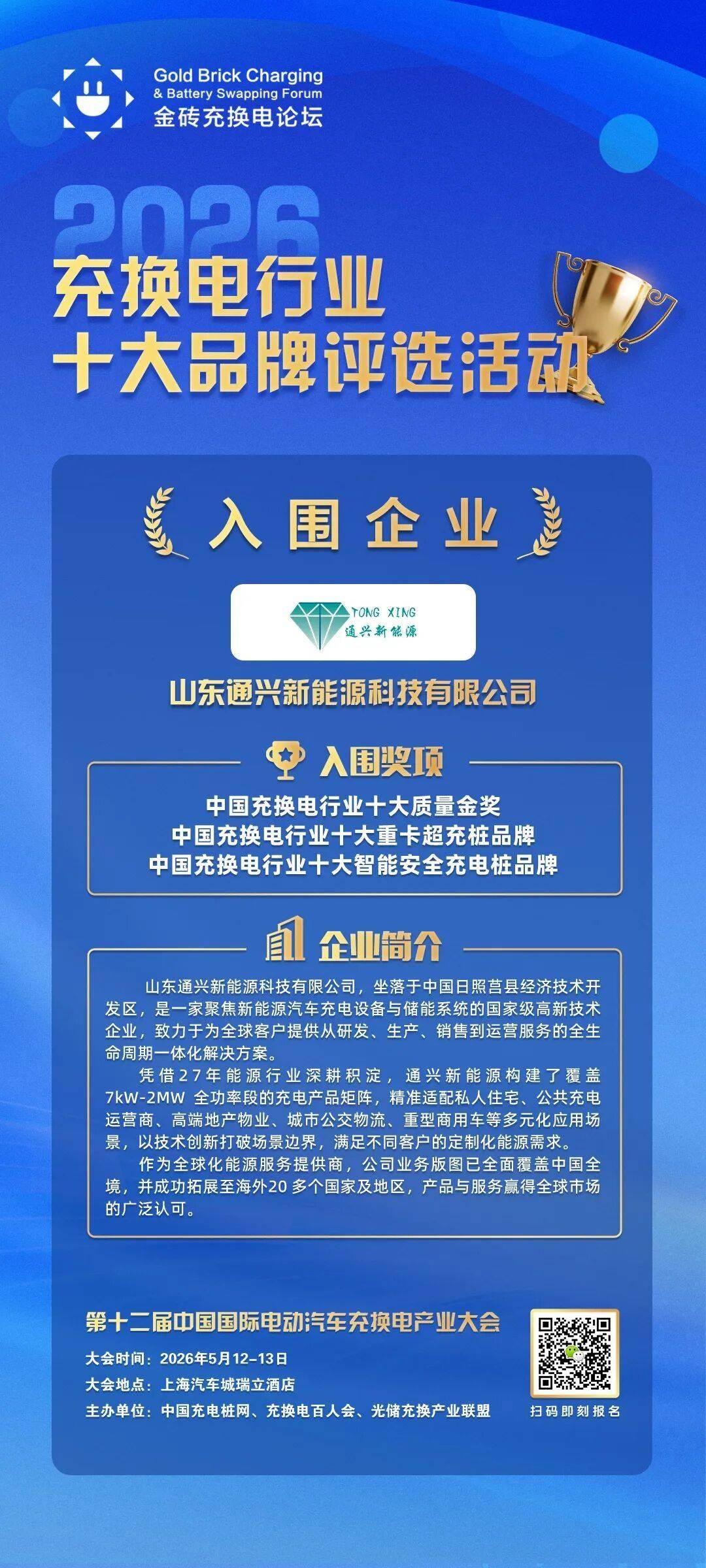 在本次評選中,山東通興新能源科技有限公司憑借全場景解決方案脫穎而出,同時入圍三大重量級獎項。這家扎根日照莒縣經濟技術開發區的國家級高新技術企業,深耕能源領域27年,構建了從7kW家用充電樁到2MW大功率充電設備的完整產品矩陣。其產品已廣泛應用于私人住宅、公共充電站、城市公交、重型商用車等場景,并成功進入海外20余個國家和地區市場,形成“研發-生產-銷售-運營”全鏈條服務能力。