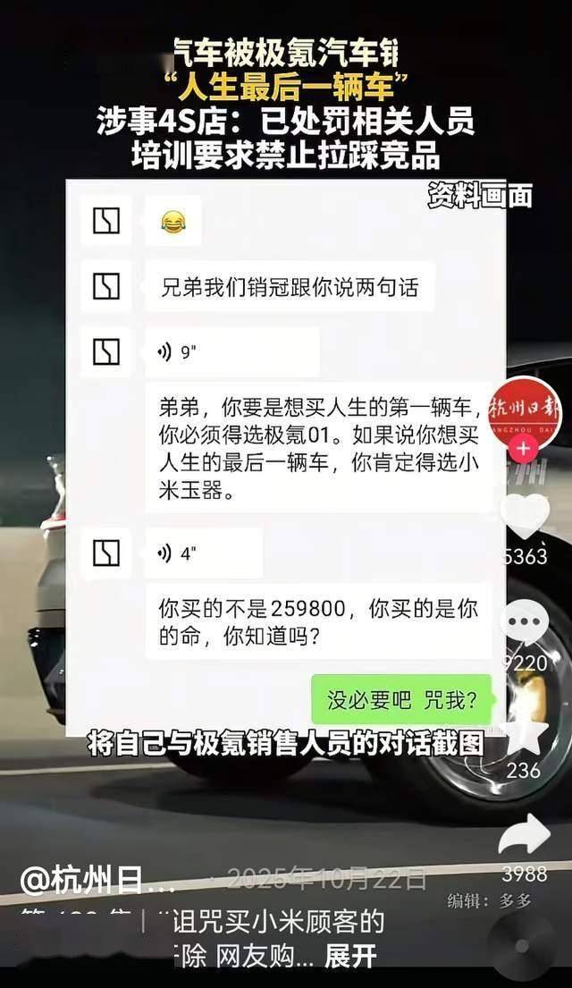 該銷售在直播中多次暗諷小米汽車,聲稱“180天造的車不敢開”,并刻意將小米汽車稱為“大米汽車”,稱其為“雜糧品牌”。更令人震驚的是,她竟公開表示“買這種車是對自己、家人和路上行人不負責”,甚至揚言“在路上看到開這個品牌的車,都會一腳油門追上去看車主長什么樣”。當網友質疑其拉踩競品時,她竟理直氣壯地回應“我這是闡述事實”。