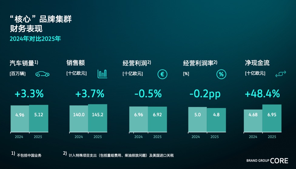 大眾汽車“核心”品牌集群在2025年展現出強勁韌性,盡管面臨多重市場挑戰,仍通過戰略調整與效率提升實現穩健增長。全年汽車銷量達512萬輛,同比增長3.3%,銷售額攀升至1452億歐元,增幅3.7%。經營利潤受重組成本、柴油排放事件及美國關稅等特殊因素影響,微降至68億歐元,但剔除這些因素后可達82億歐元,與既定目標高度契合。