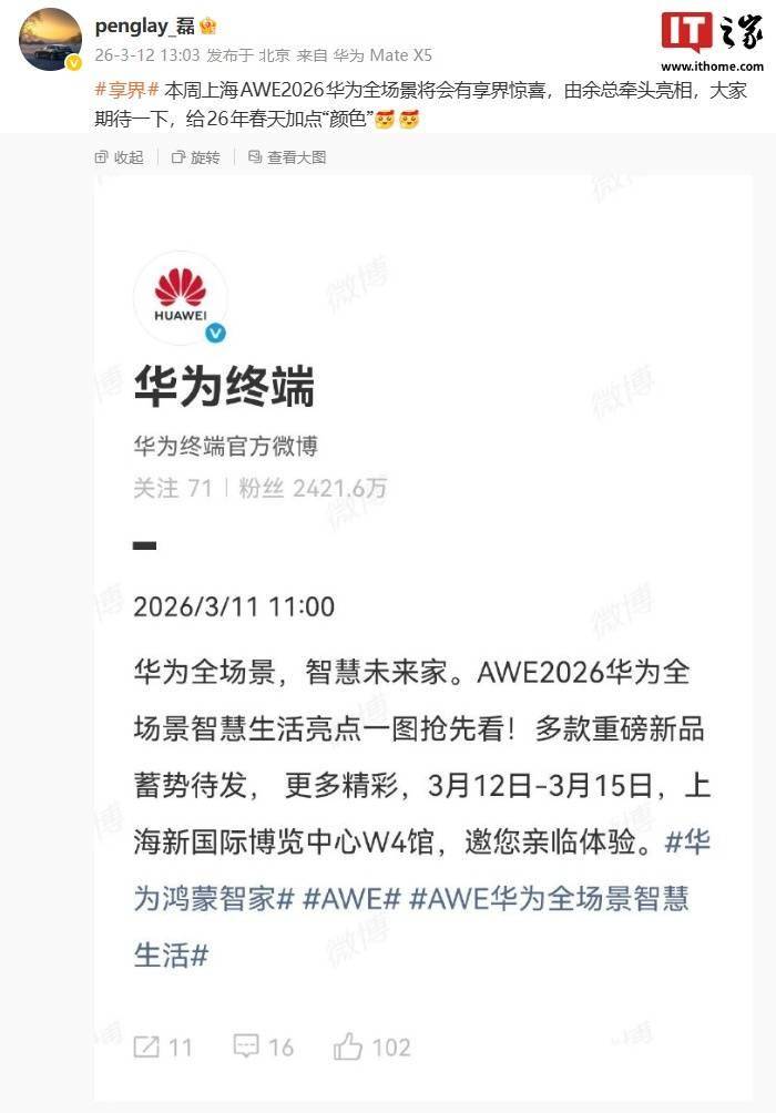 華為終端官方近日對(duì)外公布了AWE 2026華為全場(chǎng)景智慧生活的“亮點(diǎn)一圖搶先看”,同時(shí)宣布將有多款重磅新品在展會(huì)上亮相,引發(fā)了科技圈和消費(fèi)者的廣泛關(guān)注。