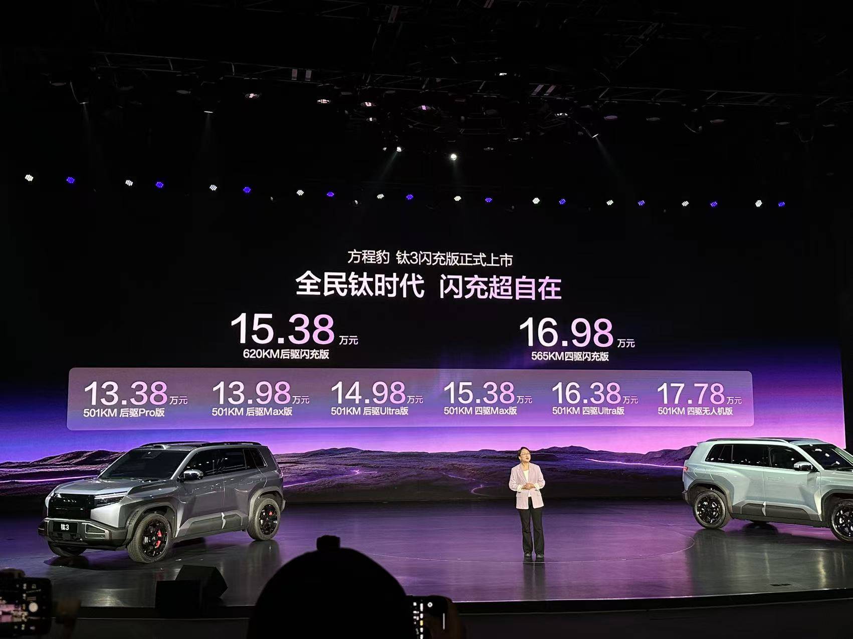 方程豹旗下鈦3閃充版近日正式登陸市場,推出后驅與四驅雙版本,官方指導價分別為15.38萬元與16.98萬元。作為品牌首款搭載比亞迪第二代刀片電池與兆瓦閃充技術的車型,該車在充電效率與續航能力上實現突破性升級,10%-97%電量補能僅需9分鐘,成為同級市場中的技術標桿。