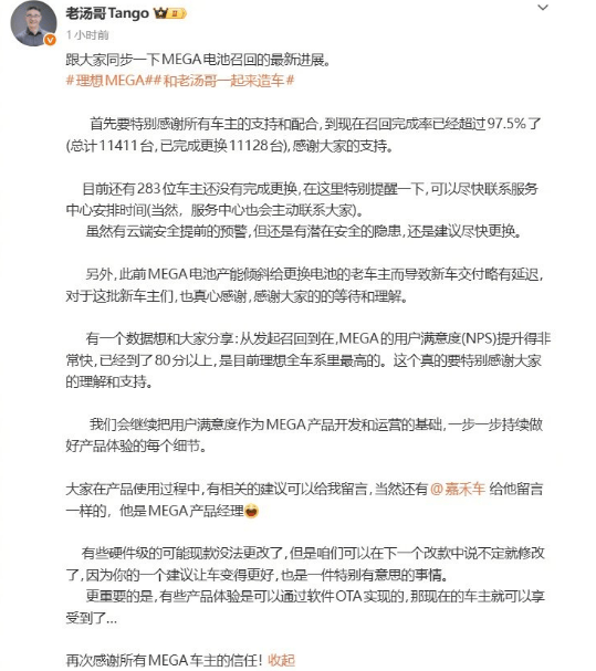 理想汽車MEGA電池召回進展:超97.5%車輛完成更換 仍有283臺待處理