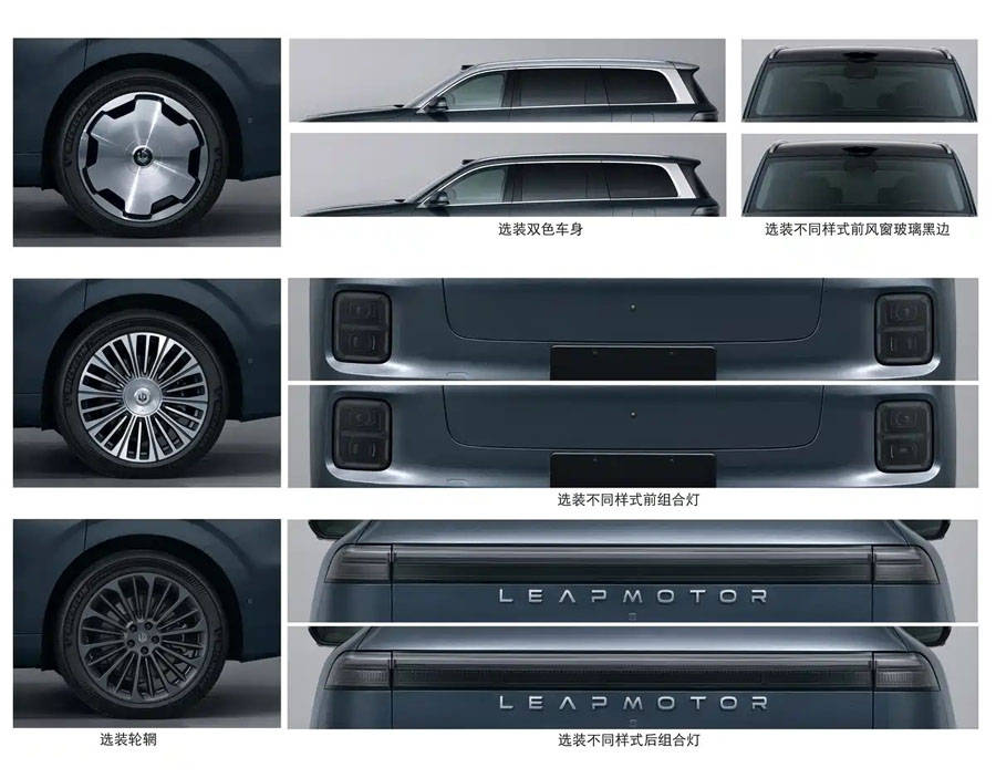 車身尺寸方面,三電機版本長寬高分別為5252/1995/1780mm,軸距3110mm,全系標配21英寸輪圈。外觀上,新車延續了雙電機版本的設計語言,但純電版與增程版在車頭細節上有所區分:純電版因無需增程器,前機艙蓋開合沿線延伸至前臉,打開后可形成深槽空間;增程版則采用常規前機艙設計,搭配封閉式前臉。用戶可根據需求選裝不同樣式輪圈、雙色車身、前后組合燈及前風窗玻璃黑邊等配置。
