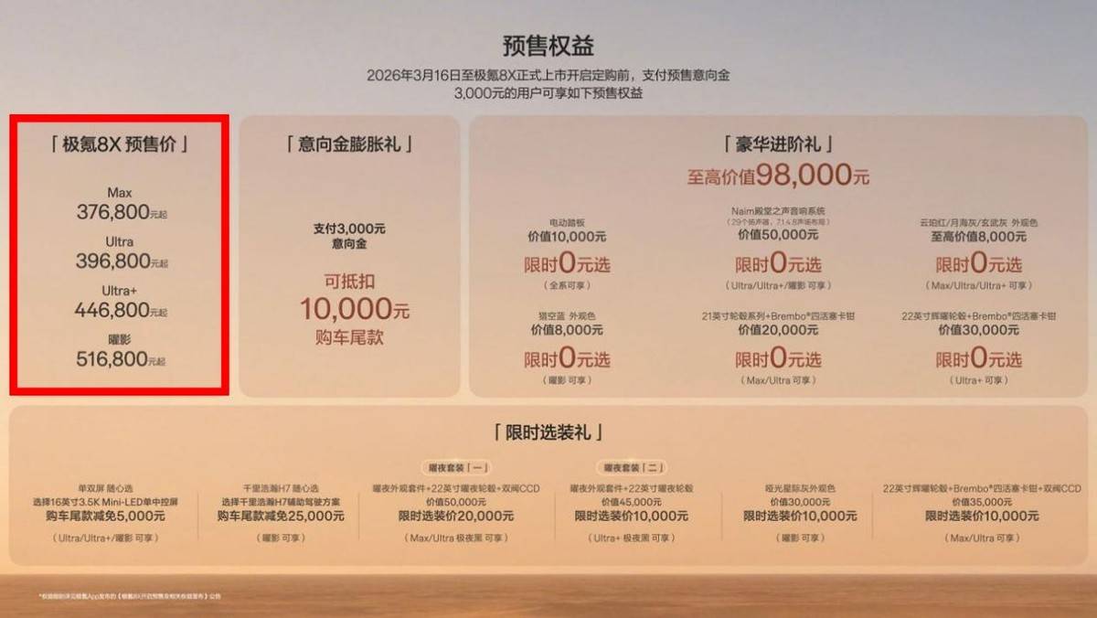 3月16日,極氪汽車攜全新高性能旗艦SUV——極氪8X正式開啟預售,預售價區間為37.68萬元至51.68萬元。這一價格區間在中大型新能源SUV市場引發了廣泛討論,有人認為頂配車型突破50萬元大關需要勇氣,也有人因其配置豐富而稱其為“價格屠夫”。