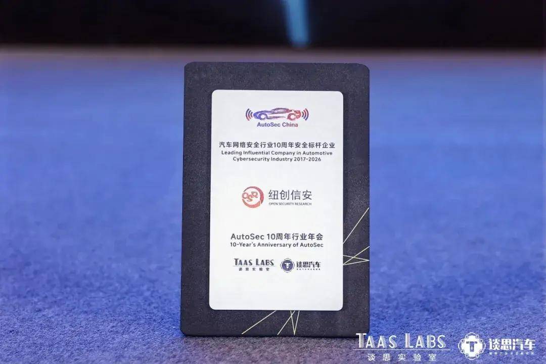 在AutoSec 2026中國汽車網絡安全及數據安全合規峰會十周年慶典上,紐創信安憑借其在汽車網絡安全領域的卓越表現,榮獲“汽車網絡安全行業10周年安全標桿企業”稱號。這一獎項是對該公司長期深耕汽車安全領域、持續推動技術創新的高度認可。