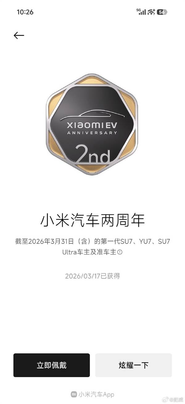 根據規則,本次發放的三枚虛擬勛章各有專屬領取條件。其中“小米汽車兩周年紀念勛章”面向本月底前持有SU7、YU7或SU7 Ultra的車主及準車主開放;“第一代SU7支持者勛章”則無車型限制,所有購買過初代SU7的用戶均可申領;而“夢想同行者勛章”僅限初代SU7、YU7及SU7 Ultra首銷期的首任車主獲取。值得關注的是,虛擬勛章領取條件較為寬松,不限制車輛過戶或賬號綁定情況,歷史車主與現車主均可按條件領取。
