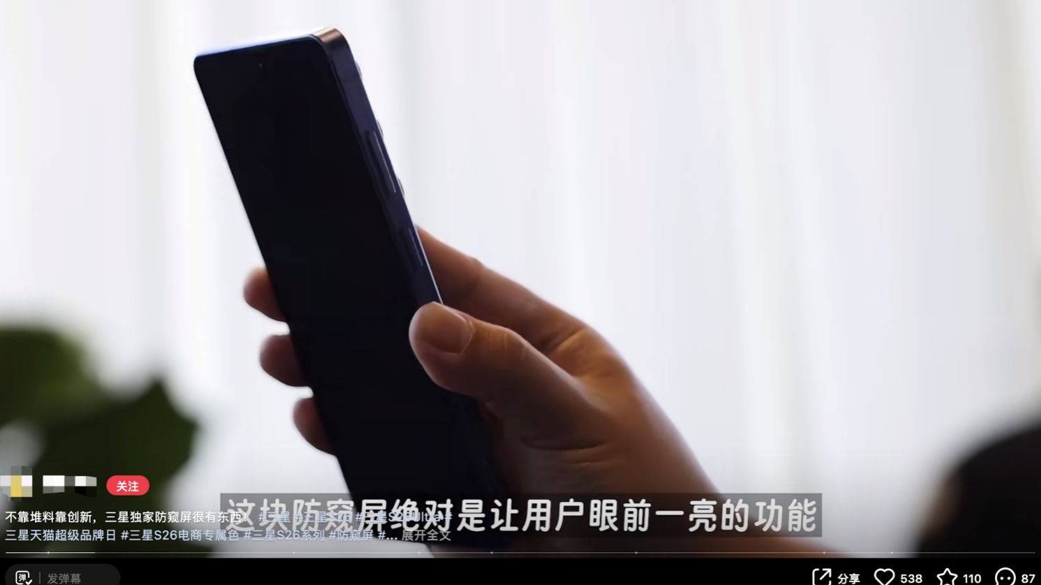 幾乎每一位評測S26 Ultra的博主,都會花大篇幅介紹那塊內置式防窺顯示屏——這也是三星首次在手機上實現硬件級別的防窺技術。