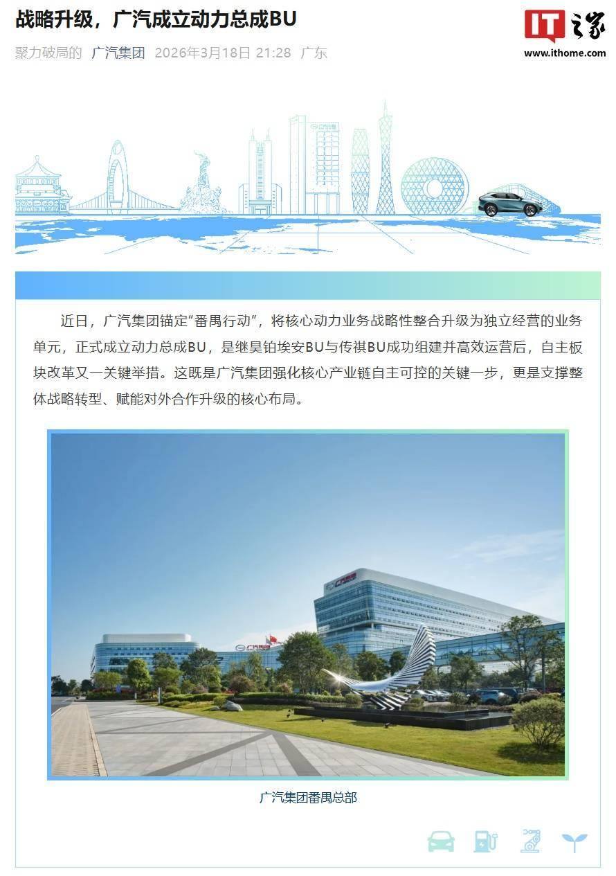 廣汽集團近日宣布,其核心動力業務迎來重大戰略調整——正式成立動力總成業務單元(BU),標志著該集團在自主品牌改革進程中邁出關鍵一步。此次整合將研發、生產、供應鏈及銷售等環節全面聚合,形成獨立運營的零部件級實體,旨在通過"研產供銷"一體化模式推動技術升級與市場響應效率提升。