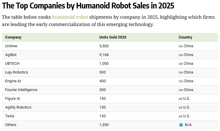 2025年,特斯拉交付了150輛Optimus,預計將于2027年開始公開銷售。同樣,其他美國領先公司 Figure AI 和 Agility Robotics 的出貨量也大致相同。盡管迄今為止交付量有限,Figure AI 的估值仍飆升至 390 億美元,遠高于 2024 年的 26 億美元。中國憑借完善的供應鏈體系、核心技術自主化突破及多場景落地優勢,穩居全球人形機器人產業第一大國。