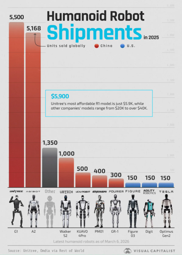 從企業出貨量份額來看,中國企業表現突出。根據中國電子報發布的《2025年人形機器人市場研究報告》,宇樹科技(Unitree)出貨量和市場份額在全球排名第一,2025年出貨量超過5500臺。此外,宇樹科技的產品在技術上也位居世界前列,價格也相對親民。例如,其最便宜的R1型號售價僅為5900美元,而該公司還出售售價1600美元的機器狗。