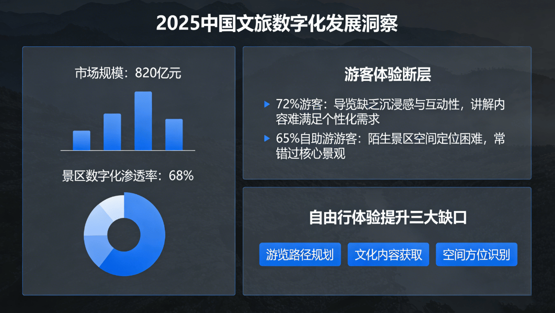 隨著《2025中國文旅數字化發展白皮書》的發布,國內智慧文旅市場正迎來爆發式增長。數據顯示,2025年市場規模突破820億元,景區數字化滲透率達68%,但游客體驗與硬件設施之間的斷層問題日益凸顯。調查顯示,72%的游客認為景區導覽缺乏沉浸感,65%的自助游游客在陌生景區中面臨空間定位困難,游覽路徑規劃、文化內容獲取和空間方位識別成為制約自由行體驗的三大痛點。