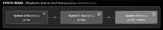 ? 深思·執行(SYNAction):面向操作智能的專屬模型架構,章魚動力首創REMA分頻多尺度端到端操作架構,在統一模型中通過三層閉環完成從認知到執行:System 2(低頻)負責任務理解、認知推理與高層規劃,System 1(中頻)負責動作策略生成、銜接認知與執行,System 0(高頻)負責底層控制與精細交互執行,助力機器人高效完成復雜操作、實現全流程執行閉環。