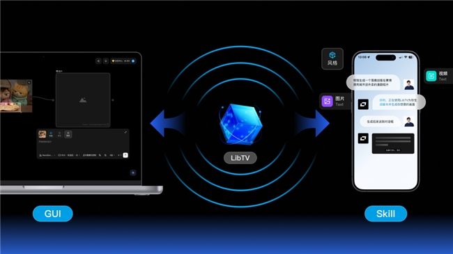 除了創作結構的調整,LibTV 另一項更受關注的變化,是其“雙入口”設計。在傳統圖形界面之外,LibTV 同時提供面向 AI Agent 的 Skill 接口,使外部 Agent 可以直接調用其視頻生成能力。通過 OpenClaw 等 Agent,用戶可以以自然語言、鏈接或文件作為輸入,由 AI 自動完成從腳本生成、分鏡設計到視頻輸出的全過程。