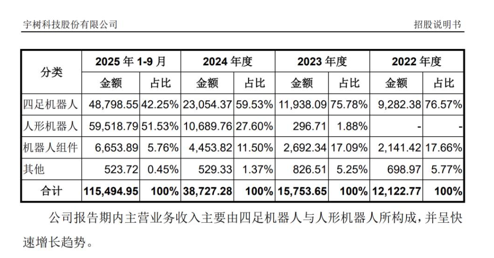 報告期內,宇樹科技主營業務收入由四足機器人與人形機器人所構成。2022年、2023年、2024年以及2025年1—9月,四足機器人收入占比逐步下降,從76.57%降至42.25%,人形機器人收入占比逐步提升,從2023年占比1.88%,到2025年1—9月達到51.53%。