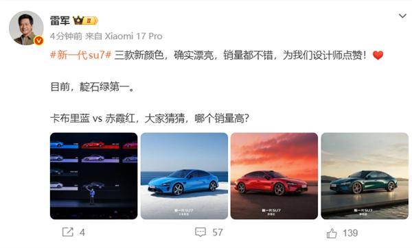 小米汽車創始人雷軍近日在社交平臺透露,新一代SU7車型開啟預訂僅三天,靛石綠配色便以絕對優勢成為銷量冠軍。他在微博中表示:"三款新配色市場反響熱烈,設計師團隊功不可沒,目前靛石綠暫居首位,卡布里藍和赤霞紅的銷量競爭仍在持續。"