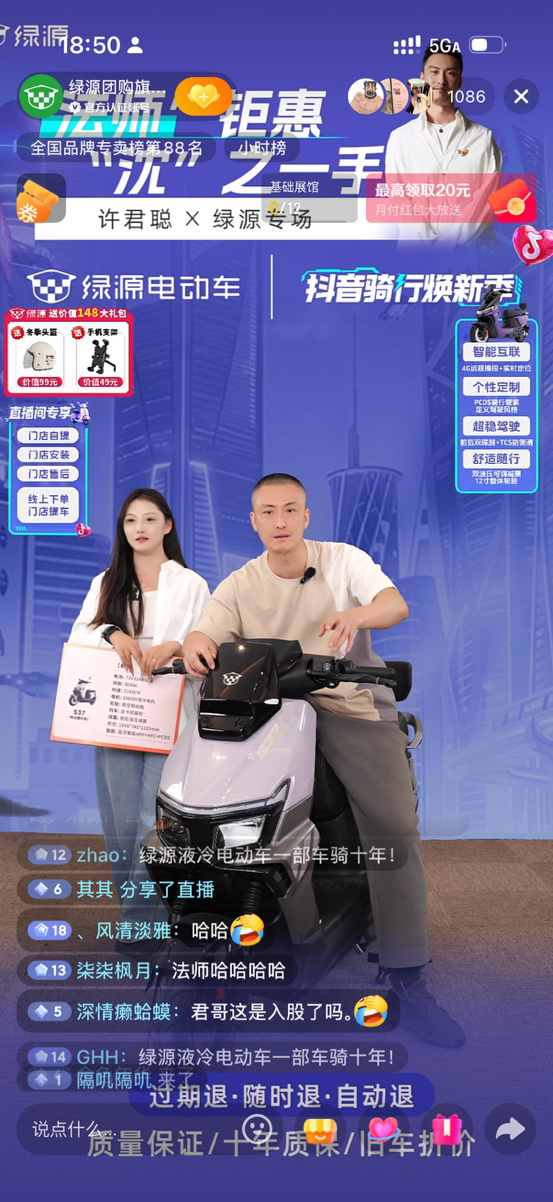 2026年開工季激戰(zhàn)正酣,綠源電動車再出重拳。通過攜手喜劇明星“法師”許君聰連開兩場專場直播,綠源成功掀起了一場現(xiàn)象級的營銷風暴。這場戰(zhàn)役不僅斬獲總曝光量超721.4萬、GMV突破189萬的亮眼戰(zhàn)績,更關鍵的是,它成功驗證了綠源“零售新模式+全域營銷”戰(zhàn)略的強大轉(zhuǎn)化能力——將線上龐大的公域流量,高效轉(zhuǎn)化為終端門店的實際銷量,為行業(yè)樹立了品銷合一的新零售標桿。