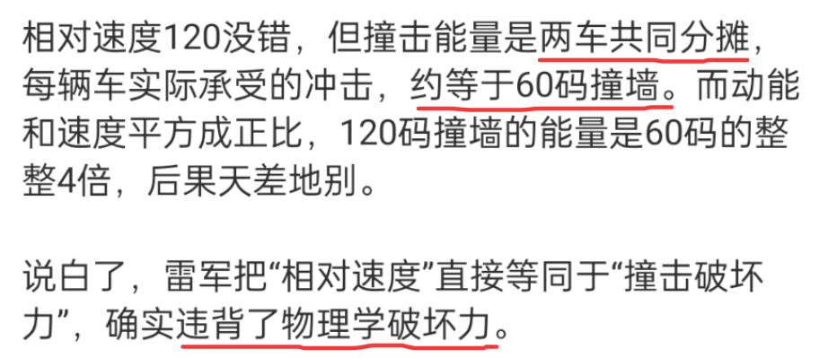 爭議源于雷軍對兩車對撞測試的解讀。他表示:“兩輛車以60公里時速相向行駛,相對速度就是120公里,相當于以120公里時速撞墻。”這番表述引發理科生集體“糾錯”——數學計算雖正確,但物理原理存在嚴重偏差。網友用生活化案例類比:“兩杯50度溫水混合不會變成100度開水”“十次10%成功率的手術疊加不等于100%康復”,直指相對速度與碰撞能量的本質區別。