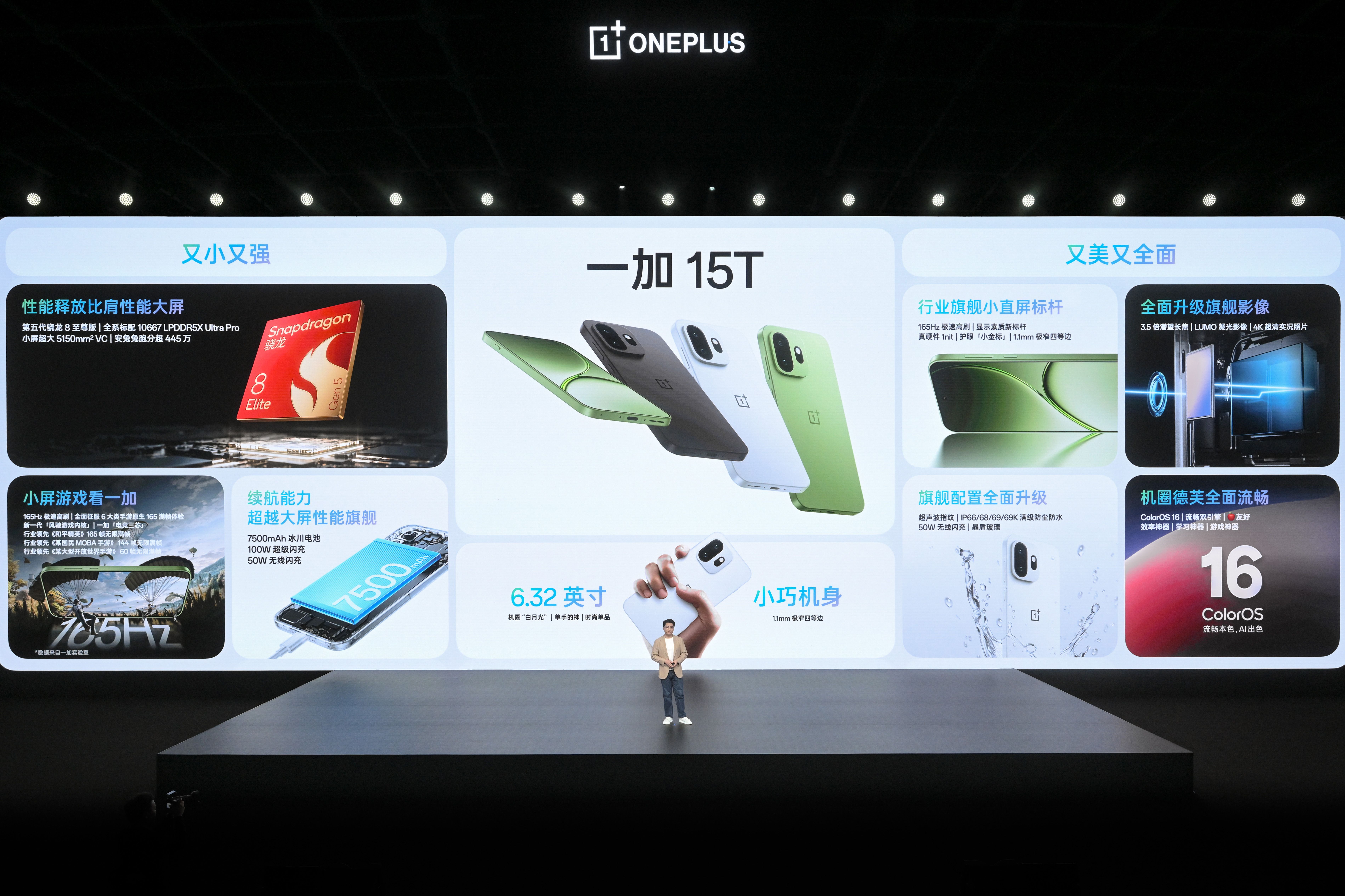 2026 年 3 月 24 日,一加全新小屏旗艦一加 15T 正式發布。作為一加數字旗艦系列的最新力作,一加 15T 在 6.32 英寸的精巧機身下,實現性能、游戲、續航、影像及系統等維度的全面躍升。一加 15T 搭載第五代驍龍 8 至尊版移動平臺、自研電競網絡芯片 G2 以及靈犀觸控芯片,配合獨家自研新一代「風馳游戲內核」與冰河散熱系統,實現行業唯一小屏手機 165 超高幀游戲體驗。一加 15T 配備 7500mAh 超巨量冰川電池+100W 超級閃充+50W 無線閃充的豪華續航回血組合,隨時隨地快速補能。一加 15T 搭載 5000 萬像素 3.5 倍潛望長焦鏡頭和 LUMO 凝光影像系統,拍人拍景都好看。一加 15T 還內置全新 ColorOS 16 系統,帶來多項高效的 AI 功能與全新的游戲助手體驗。此次一加 15T 帶來「治愈白巧」、「松弛抹茶」和「純粹可可」三款配色。