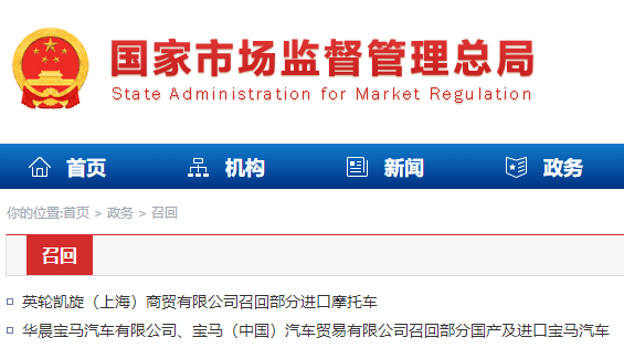 國家市場監督管理總局近日對外披露,英輪凱旋(上海)商貿有限公司與華晨寶馬汽車有限公司、寶馬(中國)汽車貿易有限公司分別提交了汽車產品召回備案計劃,涉及多款進口摩托車及國產、進口寶馬汽車。