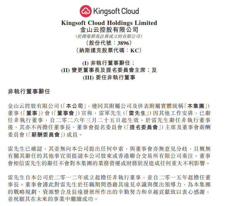 金山云近日在港交所發布重要人事變動公告,公司原非執行董事雷軍因工作重心調整,已正式辭去相關職務,該決定自3月25日起生效。此次變動不僅涉及非執行董事職位,雷軍同時卸任董事長、董事會提名委員會主席及薪酬委員會成員等核心職務,標志著其全面退出金山云管理層。