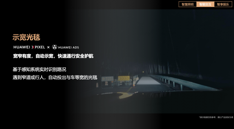 此外,HUAWEI XPIXEL智能車燈模組還可通過車燈清晰傳遞車輛意圖。車輛行經窄路時,其搭載的“示寬光毯”功能會依托華為乾崑智駕ADS實時感知路況,自動在路面上投射出一條與車身等寬的照明光毯,輔助駕駛者提前快速判斷能否通行,不用再憑感覺“硬擠”。