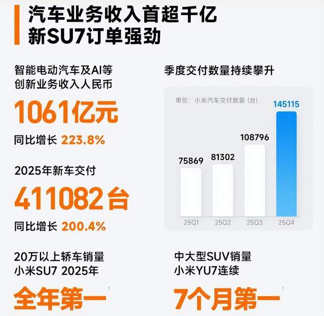 轉折點出現在2025年第四季度。最新財報顯示,小米汽車單季營收突破372億元,同比激增123%,占集團總營收的32%。這一數據標志著汽車業務已與智能手機、AIoT設備形成三足鼎立之勢,共同構成小米的核心增長極。更值得關注的是,汽車板塊的毛利率達到22.7%,顯著高于行業平均水平,顯示出強大的盈利能力。
