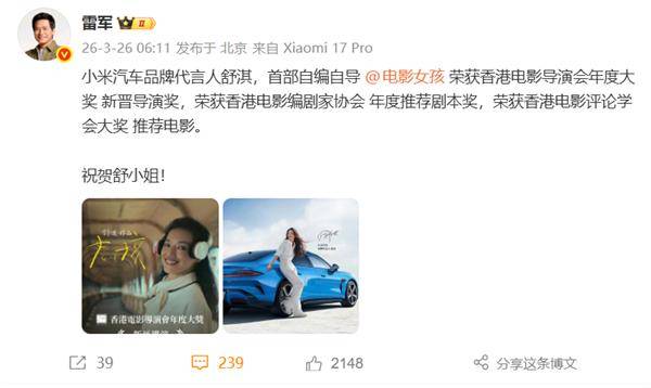 舒淇轉型導演首作《女孩》攬多項大獎 雷軍發文祝賀:從演員到故事掌控者