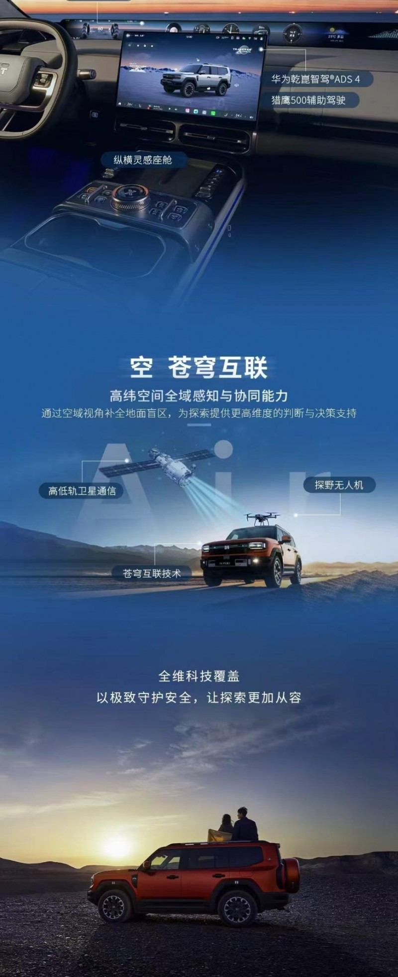 縱橫GAIA全領域智控系統空域高緯感知能力的布局,則為越野探索補上了關鍵的高維視角,通過衛星通信、無人機協同等技術構建起全域感知體系,為車輛的全領域探索提供更高維度的決策支撐,讓越野探索的安全性與邊界感實現雙重升級。