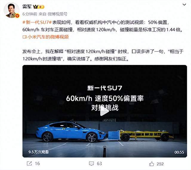 面對外界的質疑,雷軍在兩天后公開承認自己在解釋相對速度時出現了口誤,并感謝網友的指正。他重申,SU7的碰撞測試數據真實有效,測試是由中汽中心進行的權威50%偏置碰撞,能量確實達到國標的1.44倍。與此同時,張朝陽也通過科普視頻詳細解釋了其中的物理原理。他指出,雖然兩車相對速度為120km/h的說法成立,但碰撞對象是質量相近的車輛,而非質量無限大的剛性墻。兩車對撞后不會立即靜止,而是會以約60km/h的速度同向運動,動能由兩車共同分攤。相比之下,撞墻時車輛的動能完全由自身吸收,沖擊力要大得多。