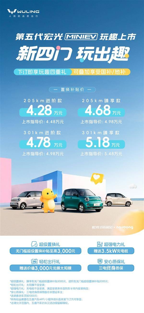 第五代五菱宏光MINIEV甜趣登場!呆萌外觀+實(shí)用配置,4.48萬起售